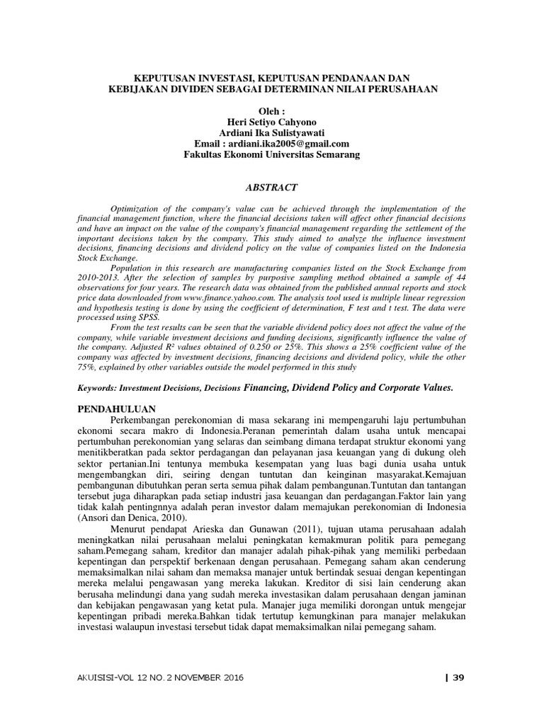 (PDF) Pengaruh Keputusan Investasi, Keputusan Pendanaan