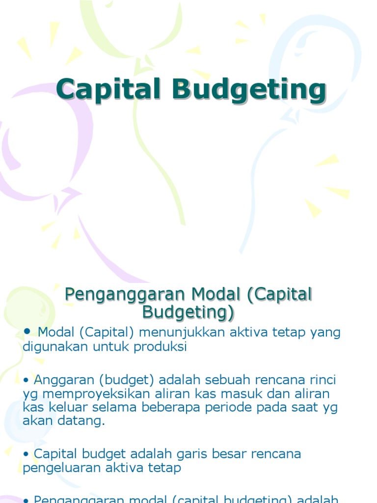 Keputusan investasi modal (capital investment decision) berkaitan dengan proses perencanaan, penetapan tujuan dan prioritas, pengaturan pendanaan, serta penggunaan kriteria tertentu untuk memilih aktiva jangka panjang. 1 keputusan investasi jangka panjang penganggaran modal penganggaran modal perencanaan pengeluaran yang akan menghasilkan penerimaan atau pengembalian sepanjang beberapa tahun. Terakhir, nilai sekarang dari aliran kas yg diharapkan dibandingkan dengan biayanya, konsep penganggaran modal keputusan penganggaran modal merepresentasikan keputusan investasi jangka panjang keputusan penganggaran modal lebih menekankan pada aliran kas daripada sekedar pendapatan digunakan tiga metode dalam menilai investasi, yakni: