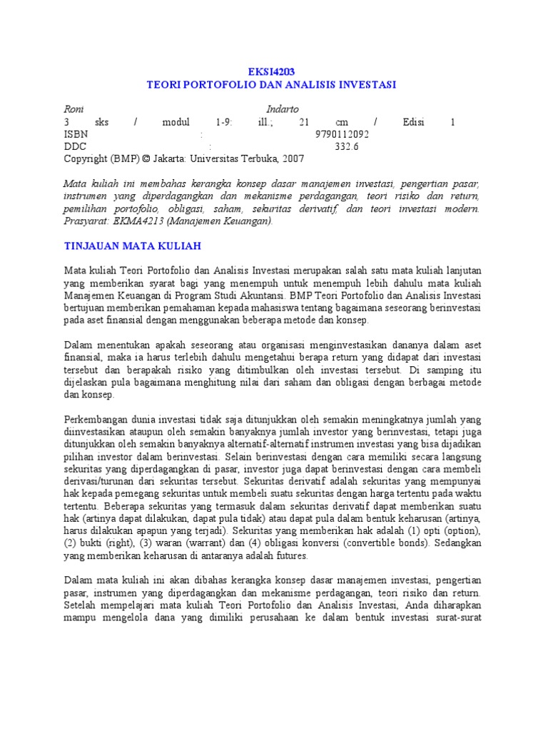 231), investasi portofolio adalah investasi dalam bentuk membeli harta keuangan seperti bond, saham perusahaan dan obligasi pemerintah. Manajemen investasi merupakan suatu manajemen profesional yang memegang berbagai sekuritas atau surat berharga seperti, saham, obligasi serta aset yang lainnya seperti properti bertujuan untuk mencapai target investasi yang dapat menguntungkan untuk investor. Soal ut manajemen eksi4203 teori portofolio dan analisis investasi dan kunci jawaban berikut ini bisa anda jadikan bahan belajar anda di rumah nantinya sebagai persiapan sebelum mengikuti uas.