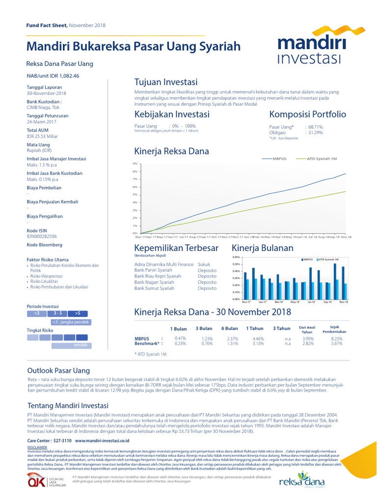 Selain deposito dan saham, reksadana adalah salah satu instrumen investasi yang jadi pilihan banyak masyarakat. Reksa dana syariah pasar uang reksa dana syariah pasar uang adalah reksa dana yang hanya melalukan investasi pada instrumen pasar uang syariah dalam negeri dan/atau efek syariah berpendapatan tetap yang jangka waktu atau sisa jatuh temponya tidak lebih dari 1 (satu) tahun. Pt mandiri manajemen investasi (mmi) dan mandiri securities singapore pte.